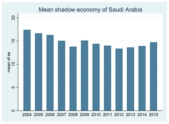 Figure 5 relates to the average mean of the shadow economy in Saudi Arabia from 2004 to 2015. It is revealed from the graph that the average mean shadow economy in Saudi Arabia has reduced during the stipulated period. The Kingdom has increased its attempts to combat the shadow economy. The decrease in shadow activities has come after multiple laws were enacted, which aimed to make sure that businesses are conducted in the Kingdom legally and with the appropriate permits in order. The hidden economy magnitude equals 20% of the Kingdom’s GDP (GDP). The shadow economy in Saudi Arabia makes up a sizable portion of the domestic workforce, especially expatriates who may not be officially registered. Official labor force statistics exclude these workers employed in the unofficial sector. The introduction of digital transactions also assists the Kingdom’s general socio-economic growth. The rise in digital payments has improved financial inclusion, created more job opportunities, reduced shadow activities, and promoted economic growth.
