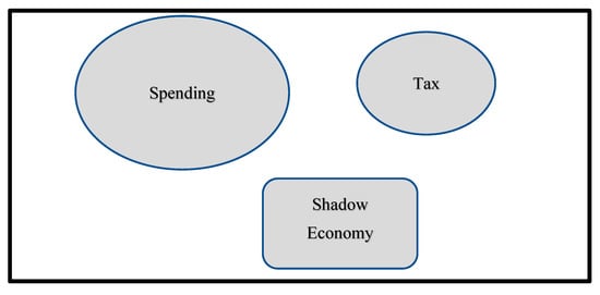 The tax burden is one of the key drivers of the shadow economy as it influences the worker’s labor and leisure time distribution and increases the cost of doing business [43,44,45]. After disturbing the labor and leisure setting of workers, they would look for other options (shadow economy) to maintain the previous labor-leisure distribution. This switching to the shadow economy will decrease, on the one hand, the government revenues and, on the other hand, will increase social and public expenditure as these people are now considered unemployed in the government documents. Still, they are employed directly in the shadow economy. So, the gap between government taxes and government expenditure will increase, and the government will compel to run a deficit budget. This scenario has been captured in the following Figure 4. As revealed in the following diagram, part of the money (tax evasion) will shadow the economy because government revenues decrease while having high spending and thus leading to a budget deficit.