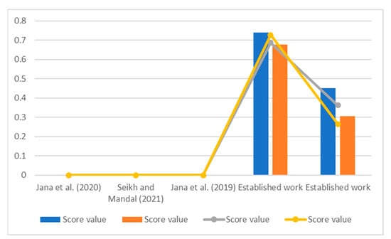 The graphical depiction of the score values of existing and proposed work [21,33,34].