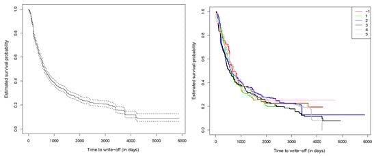 Risk management in the credit risk environment has advanced considerably over the last few decades, and during the same time, statistical models developed for this purpose have grown in variety and sophistication. Initially, statistical modelling focused on the assessment of a counterparty’s creditworthiness (i.e., default risk), but the modelling of the recovery process and outcome after default are receiving increasing attention. Two main outcomes or resolutions are possible after default: either the outstanding amount is fully recovered or the loan is written off. Modelling the time to write-off of a defaulted loan is valuable to a bank, as the time on book of such loans not only affects its operational decisions but also its profitability [1]. Survival analysis has enjoyed increasing popularity in the credit risk environment for modelling of the time to default and, more recently, to model the time to resolution of a defaulted loan (see, e.g., [2,3,4,5]). Since write-offs are typically associated with longer resolution times than full recoveries, the number of write-offs is usually under-represented in samples of defaulted loans [6]. This makes survival analysis particularly suitable for modelling the time to write-off because the status at the end of the observation period is often recorded as “not resolved”, i.e., censoring is present.