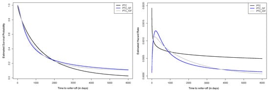 The MLEs of the model parameters are shown in the first three columns of Table 5. For both frailty models, the frailty parameters ( and , respectively) are significant at the 5% level based on the adjusted log-likelihood test. In line with the findings of Khieu et al. [42] and Betz et al. [43], a negative relationship between GDP growth and time to write-off is observed. This means that higher GDP growth at the time of default is associated with a higher probability of full loan repayment. This makes intuitive sense, especially when considering the price at which collateral can be sold or the prospects for a firm to recover from financial distress and settle outstanding loan obligations. Also shown in Table 5 are the calculated log likelihoods, AIC and BIC. Based on all three goodness-of-fit measures, the PTC model with gamma frailty performs the best out of the three models.