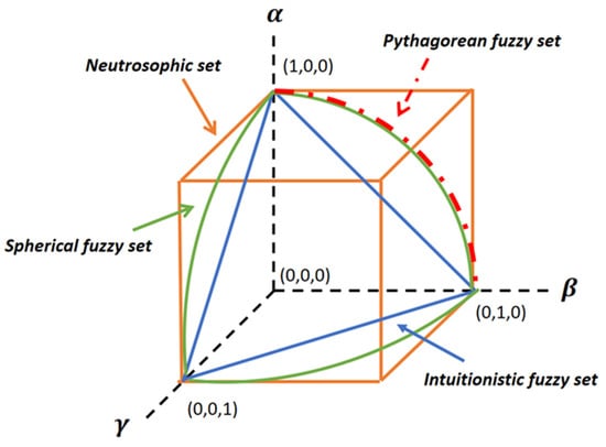 According to Mahmood et al. [19] or Kahraman and Gündoğdu [20], when it comes to complex issues, individuals tend to convey their level of satisfaction, abstention, and dissatisfaction in different ways. In response to this, the concept of SFSs was developed, which includes the degree of membership α(x), the neutral-membership degree β(x), and the non-membership degree γ(x), ultimately providing a more comprehensive understanding of the situation. Spherical fuzzy linguistic scales are presented in Figure 1 and Table 3.