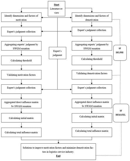 In the context of HRM problems, it is appropriate to employ an MCDM approach that utilizes SFSs to capture the uncertainty and ambiguity inherent in expert evaluations. Among the various MCDM models, the Delphi and decision-making trial and evaluation laboratory (DEMATEL) methods represent a balanced approach between quantitative and qualitative analysis, including subjective judgments and linguistic variables typically ignored by conventional research methods [24]. Notably, the Delphi method serves as a useful MCDM tool for verifying crucial factors before evaluating them. The DEMATEL model is better suited than the analytic hierarchy process (AHP) and analytic network process (ANP) models for exploring the interrelationships among the various factors. The DEMATEL model evaluates the interrelationships among factors, capturing both direct and indirect relationships, leading to a more comprehensive understanding of the factors influencing employee motivation and demotivation. Unlike previous studies reviewed in this literature, this study aims to better reflect the interrelationships between criteria that directly affect the decision-making process. Rather than treating criteria as independent concepts, this research proposes a two-stage, data-driven approach that combines SFS and MCDM models to comprehensively analyze and evaluate the significant factors that impact employee satisfaction in the Vietnamese logistics service industry from both motivational and demotivational perspectives.