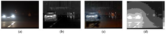 Figure 1d is the cluster map of the visible image shown in Figure 1a [21]. By comparing Figure 1a,d, it can be seen that the high-brightness areas contain a large amount of halation information and a small amount of important information, such as license plates and lane lines. In the areas closer to the halation, the brightness increases obviously.