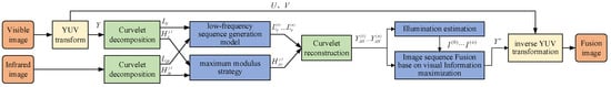 Firstly, the Luminance Y, the Chrominance U, and V of the visible image are obtained by the YUV transform. Then, curvelet decomposition is used to get the low-frequency and high-frequency components of the Luminance Y and the infrared image, respectively. The obtained low-frequency components are input into the low-frequency sequence generation model to get the fused low-frequency sequences with the halation elimination degrees from small to large. The obtained high-frequency components are processed by the maximum modulus strategy to get the fused high-frequency component. The fused low-frequency sequences and the fused high-frequency component were reconstructed by curvelet transform to get the anti-halation brightness sequence YAH. The fusion weight of each component in the sequence YAH is determined according to their illumination estimation results. Then the weighted sum of the sequence YAH gets a new Luminance Y′. Finally, the Luminance Y′ and the original Chrominance U and V are fused by the inverse YUV transformation to obtain the fusion image without halation. The overall block diagram of the proposed night vision anti-halation algorithm is shown in Figure 2.