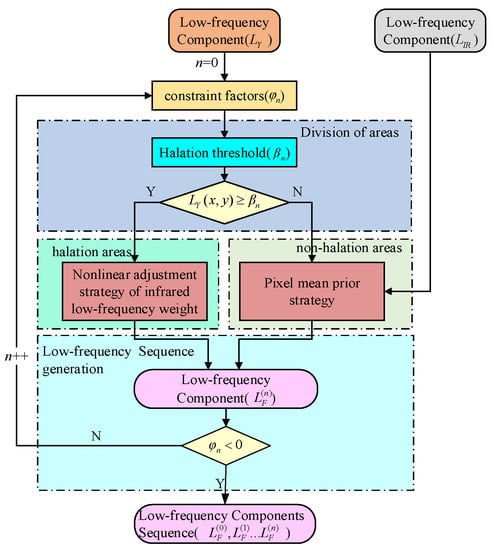 The LY is divided into the halation and the non-halation areas by halation threshold. Then the low-frequency components of the two areas are generated according to the low-frequency weight adjustment strategy of the corresponding area and are weighted with the infrared low-frequency component LIR to generate the low-frequency component LF of the fusion image, then judge whether the constraint conditions are met. If not, continue to iterate to generate new low-frequency components. Stop iteration until satisfied and output the low-frequency sequences with different degrees of halation elimination. The process of the low-frequency sequence generation is shown in Figure 3.