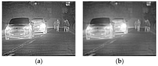 As can be seen in Figure 1b, the contours of vehicles, pedestrians, and background in the infrared image are clearly visible. However, the infrared image is a gray-level image with low resolution and missing details and exists on some problems, such as disappearing license plate information and indistinct lane lines.