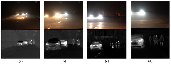 When the oncoming cars are close on the residential road at night, the halation area formed by the headlights is larger. In the visible image, the illumination distribution is uneven, and the halation is dazzling. In addition, some useful information, such as lane lines, that benefit from the halation becomes more obvious. In the infrared image, the contours of vehicles, pedestrians, and buildings are clear, but some important information, such as lane lines, is lost.