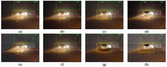In contrast, AP-SPCNN, RE-IFS, IIHSDCT, and the proposed algorithm retain the high-brightness lane lines while eliminating the high-brightness halation. Where AP-SPCNN, IIHSDCT, and the proposed algorithm effectively improve the background luminance. However, the contour of pedestrians is blurred by AP-SPCNN, and there are obvious light–dark alternating shadows around the headlights by IIHSDCT, resulting in the loss of local textures and details. RE-IFS enhances the contours of vehicles and pedestrians, but the background brightness is too low.