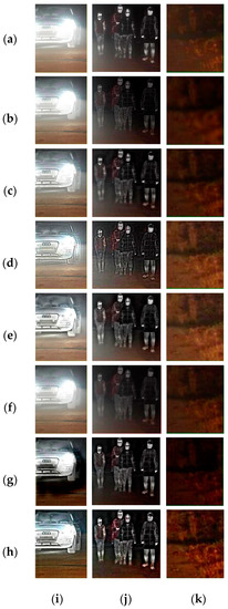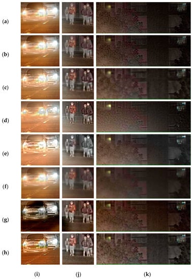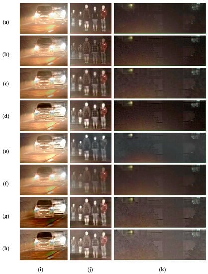 The zoomed-in images of subregions for different fusion images in Scene 4. (a) IGFF; (b) AP-SPCNN; (c) FPDE; (d) RE-IFS; (e) TT-CSR; (f) YUVWT; (g) IIHSDCT; (h) Ours; (i) high-brightness region; (j) pedestrians; (k) background.