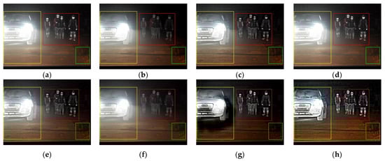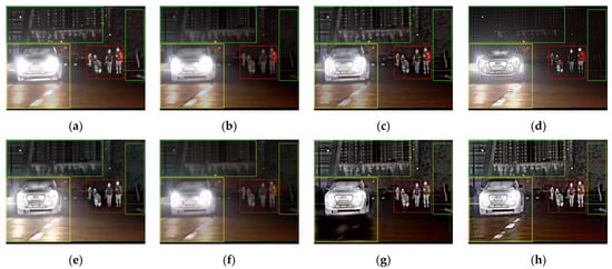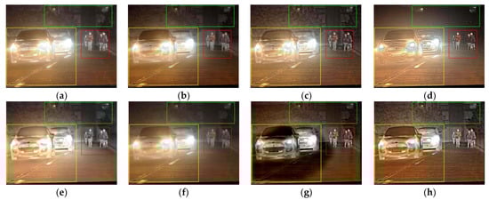 The existing active anti-halation methods include sticking polarizing film on the front windscreen [2], infrared night vision imaging [3,4,5], an array of CCD image sensors with a pixel integration time independently controllable [6], two visible image fusions with different light integration times [7], etc. Among them, multi-exposure image fusion [8] and infrared and visible image fusion [9,10] have lower halation retention and better visual effects.