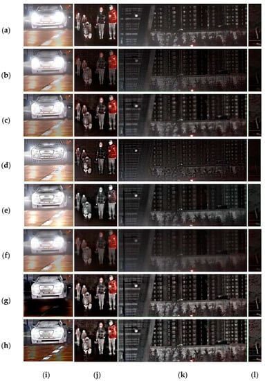 The zoomed-in images of subregions for different fusion images in Scene 3. (a) IGFF; (b) AP-SPCNN; (c) FPDE; (d) RE-IFS; (e) TT-CSR; (f) YUVWT; (g) IIHSDCT; (h) Ours; (i) high-brightness region; (j) pedestrians; (k) background-building; (l) background-tree.