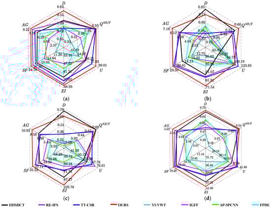 To evaluate the visual effects of fusion images of different algorithms comprehensively, the objective indexes of six algorithms under four scenes are drawn into the radar chart, as shown in Figure 17.