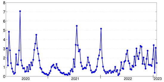 Let us denote by the daily values of , found in Section 7, to solve IDPs for the difference scheme with weights , and using (29). In a similar way, using the daily values of the parameters and (12) we found the values for each day of the considered time-period of the epidemic in Bulgaria (8 March 2020–12 February 2023). Then, using (35), we calculate the daily sensitivity indices of the parameters of . The mean values of the sensitivity indices are given in Table 2.