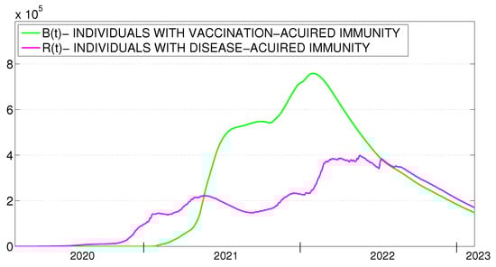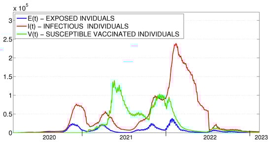 It is possible to study the impact of the basic reproduction number on the global asymptotic stability of the disease-free equilibrium point and the epidemic equilibrium points (with ) of the autonomous SEIRS-VB model (3). Commonly used methods to perform a global stability analysis are the method of Carlos Castillo-Chavez [14,38,39] and the direct Lyapunov method [12,15,37,40]. However, this would be of no practical importance because the long-term behaviour of a complex real-world process such as the COVID-19 epidemic cannot be described by models with constant parameters. For this reason, as already noted, we applied the autonomous system (3) to describe the daily changes in the number of individuals in different categories in the SEIRV-BD model. The results are step functions, as are the available data.