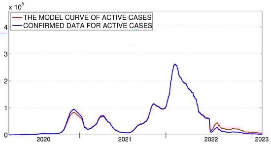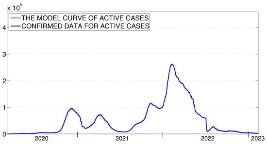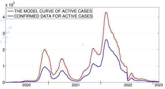 We returned (see [10,35,36]) to the concept of the disease-free equilibrium point which means the equilibrium point of system (3), in which and . We will use this equilibrium point to define the basic reproduction number associated with the model (3). We then find the daily values which are very important because they measure the transmission potential of a disease. Actually, the non-linear autonomous system (3) also has other equilibrium points, which are called endemic. However, the study of these points is not the subject of the present work, because they are only related to an autonomous system, not to a system with time-variable coefficients (1) used to model the long-term development of the COVID-19 epidemic.