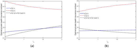 Figure 1 shows the effects of and on the optimal private health insurance contract. We can see from Figure 1a that and are increasing and decreasing, respectively, with respect to . These findings are consistent with our theoretical results in the last section. More importantly, we find that the private health insurance premium is increasing with respect to . With an increase in , the policyholder would purchase more private health insurance to diversify their health risks. This means that the policyholder intends to sign a private health insurance contract. Therefore, the result of the game between the policyholder and the insurer is an increase in the private health insurance premium. We find from Figure 1b that and are both increasing with respect to . These findings are also consistent with our theoretical results in the previous section. Furthermore, we find that the private health insurance premium is decreasing with respect to . When increases, the insurer is unwilling to sign a private health insurance contract. This leads the insurer to increase the price of the private health insurance premium. Hence, the result of the game between the policyholder and the insurer is a decrease in the private health insurance premium.