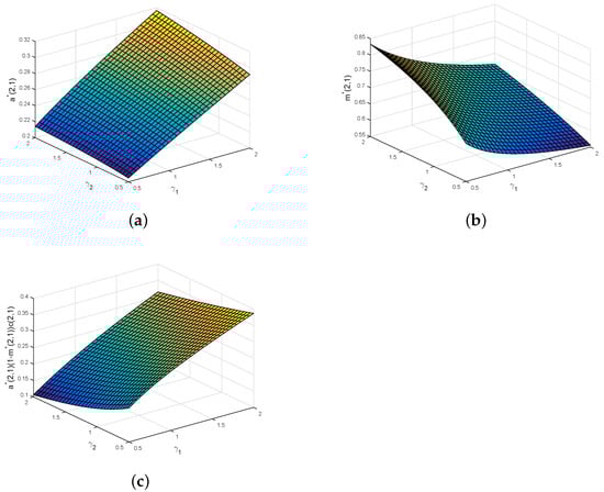 Figure 2 further examines the joint effects of and on the optimal private health insurance contract. From Figure 2a,b, it is clear that (resp. ) is more sensitive to (resp. ) than that to (resp. ). This implies that the insurer and the policyholder are more sensitive to the other’s risk aversion degree. The reason may be that the other party’s risk aversion coefficient corresponds to the uncertainty of the private health insurance premium. We can see from Figure 2c that is more sensitive to than to . This is due to the fact that the policyholder is the payer of the private health insurance premium, whereas the insurer is the receiver of the private health insurance premium.