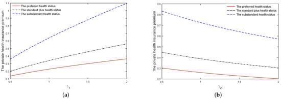 Figure 4a displays the effect of on and . We can see from Figure 4a that, whether the policyholder buys private health insurance or not, the change trends of and with respect to are consistent. Here, stands for the intensity of the number of illnesses. As becomes larger, the policyholder bears more illness expenditure the policyholder. Therefore, and monotonically decrease with respect to .