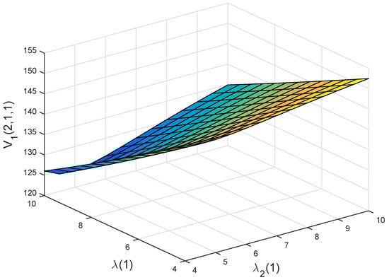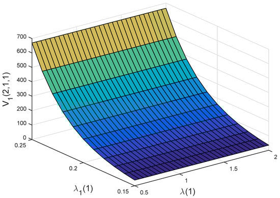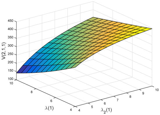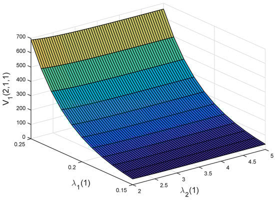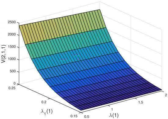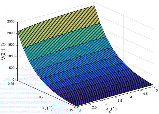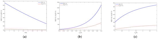 Figure 4b,c illustrate the effects of and on the optimal value functions and . Here, and stand for the growth intensity of the disposable income and the parameter of exponential distribution of illness expenditure. As becomes larger, the policyholder will have more the disposable income. Hence, and are increasing with respect to . As becomes larger, illness expenditure will decrease. This would lead to a decrease in the willingness of a policyholder to buy private health insurance. Therefore, the premium of the private health insurance becomes smaller, and thus and are increasing with respect to .