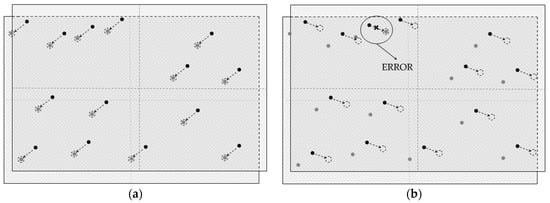 Determining the shift parameters between measurements in frame (gray dot) and catalog or other frame (black dot): (a) Correct identification; (b) Wrong identification.