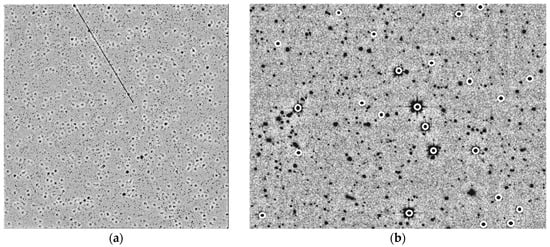 One of the necessary requirements for the method of preliminary sky identification is its that it be resistant to various kinds of destabilizing factors [28]. First, the possible presence of a bright track of an artificial earth satellite in one of the frames. When a bright satellite [29] enters the frame, its image can illuminate the frame, forming many false measurements (Figure 2a). Second, the effect of charge flow when images of the brightest stars in frame lead to a decrease in the accuracy of the estimation of their position, which makes them undesirable candidates for reference stars (Figure 2b). To ensure the stability of results of the preliminary sky identification, the CCD-frame is divided into a predetermined number of regions of the same size Mreg × Mreg. From each such area, the same predetermined number of the brightest objects is selected Nmea_reg. Thus, the selected measurements will be evenly distributed over the frame, which will help to minimize the probability of errors in the preliminary sky identification. Such a selection of measurements will allow, for example, to exclude from consideration many bright false measurements caused by the charge flow of a large star or a bright satellite track.