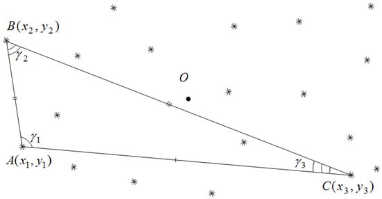 The initial data for obtaining the plate linear constants by the finite statistical method are, on the one hand, the positions of three stars in the identified frame in the coordinate system (CS) of this CCD-frame (Figure 3). On the other hand, the ideal coordinates of the corresponding catalog stars. To obtain the ideal coordinates of the catalog stars from their equatorial coordinates, it is sufficient to have some approximation of the equatorial coordinates of the frame’s optical center. The points in Figure 3 correspond to three stars used, and their coordinates are indicated as A(x1, y1), B(x2, y2), C(x3, y3). The catalog equatorial coordinates of these stars correspond to the ideal coordinates A(ξ1, η1), B(ξ2, η2), C(ξ3, η3), respectively. The ideal coordinates of an object with its coordinates in the CS of the CCD-frame are related by the reduction equation [30]: