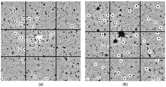 (a) The brightness measurements in a frame; (b) Uniform distribution of the reference stars in a frame.