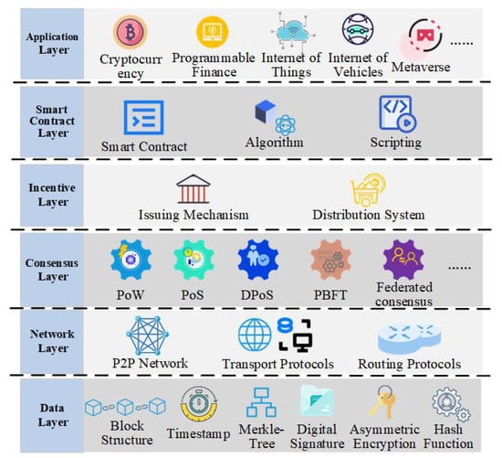 - The data layer encapsulates the blockchain’s underlying encryption technology and data storage method;