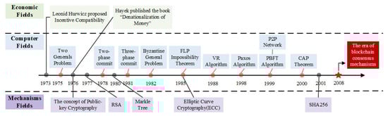 The concept of consensus starts with distributed systems. The critical problem addressed by distributed consensus mechanisms is implementing certainty and consensus to return reliable consensus results across the entire distributed network. Before the introduction of blockchain, the consensus mechanisms to solve the problem of consistency and consensus of the distributed system could be considered classic distributed consensus mechanisms. The traditional distributed consensus mechanisms and related technologies have laid a solid theoretical foundation for blockchain consensus mechanisms. The theoretical bases of blockchain consensus mechanisms are shown in Figure 4.