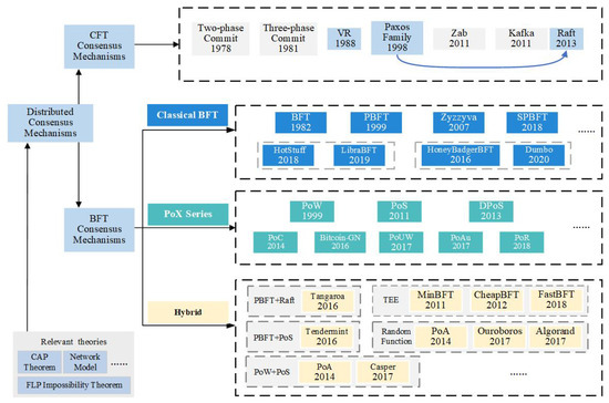 Based on BFT and CFT, the BFT consensus mechanisms can be further divided into classical BFT consensus mechanisms, proof of something (PoX) series consensus mechanisms, and hybrid consensus mechanisms. Some popular blockchain consensus mechanisms are shown in Figure 5.