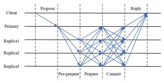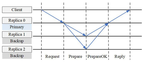 The VR mechanism is based on the primary copy technique [60]. Expressed in professional terms, it is a primary backup approach or a passive replication mode [61]. One feature of the VR mechanism is that it uses the primary, just one of the replicas, to order client requests; the other replicas are backups. The primary has the authority and responsibility to determine the order of client requests, and the backups need to accept the order selected by the primary. When the primary replica fails, the VR mechanism performs a process called view change to select a new primary for the system. The process of choosing the primary is realized by voting. If the failed one is not the primary one, there is no need to enter the phase of reselecting the primary node. When the replica is unable as either the primary or backup, VR provides a way to recover and continue; its consistency process in the normal case is shown in Figure 6.