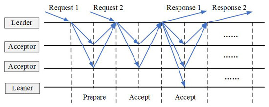 Basic Paxos mechanism can only form a decision on one request. Nevertheless, it is necessary to continuously determine multiple requests, and the processing should be efficient in practical applications. To solve this problem, Multi Paxos provides two improvements based on Basic Paxos. First, to determine each value, an instance of the Paxos mechanism is run to form a resolution. A unique instance ID identifies each Paxos instance. Second, a leader is elected from all proposers, and the leader uniquely submits the proposal to the acceptors for voting. In this way, the proposer has no competition, and the live lock problem is resolved. When there is only one leader in the system to submit the value, the preparation stage can be skipped; thus, system efficiency is improved. The flow of Multi Paxos is shown in Figure 8.