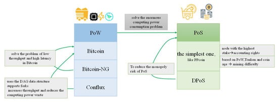 The scope of blockchain applications has gradually expanded, and the requirements for blockchain have proportionally increased. Different types of blockchain platforms and application scenarios adopt different consensus mechanisms, especially in the financial and business intelligence fields, where high security, scalability, high throughput, and low latency are required to optimize business processes and reduce operating costs. For instance, Vukolić [23] highlighted the importance of selecting an appropriate consensus mechanism for a given application, taking into account factors such as security, efficiency, and scalability in 2015. Next, using the properties given by Vukolić, Zheng et al. [24] provided an overview of blockchain architecture and a comparison of different consensus mechanisms. Later, Viriyasitavat et al. [25] analyzed the consensus mechanisms that had been exercised, which can promote collaboration, knowledge sharing, and collective decision making in the blockchain-enabling business process 4.0. Concurrently, Biswas et al. [26] proposed a proof of block and trade (PoBT) consensus mechanism for IoT blockchain to make business processes efficient and smart. Later, in 2022, Xu et al. [27], and Wang et al. [28] combined federated learning algorithms to optimize blockchain technology and the consensus mechanism. Therefore, a remarkable research effort has been devoted to solving the problem that traditional consensus mechanisms cannot simultaneously satisfy the need for high security, high scalability, high throughput, and low latency in financial technology scenarios. The innovation of consensus mechanisms has become the key to promoting blockchain applications in these fields, requiring credibility and high-quality data for decision making. It is still a hotspot in research.
