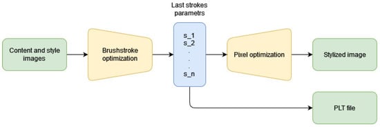 Figure 1. Fragment of the flowchart for the neural style transfer algorithm. Parameterized strokes are present only during brushstroke optimization; thus, they are exported right before the start of pixel optimization.