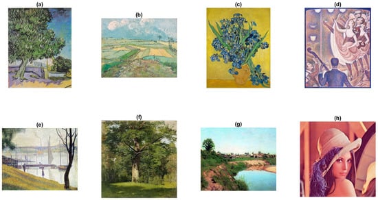 Figure 2. The test set: (a) Vincent van Gogh, “Chestnut Tree in Blossom”, 1890, 651 × 518 pixels; (b) Vincent van Gogh, “Wheat Fields at Auvers under Clouded Sky”, 1890, 516 × 654 pixels; (c) Vincent van Gogh, “Vase with Irises Against a Yellow Background”, 1890, 646 × 515 pixels; (d) Georges Seurat, “The Bridge at Courbevoie”, 1886–1887, 515 × 623 ; (e) Georges Seurat, “Le Chahut”, 1889–1890, 622 × 515 pixels; (f) Isaac Ilyich Levitan, “Oak”, 1880, 527 × 517 pixels; (g) Isaac Ilyich Levitan, “Village on the River Bank”, 1883, 515 × 616 pixels; (h) “Lenna”, 512 × 512 pixels.