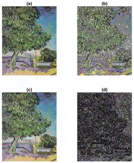 Figure 3. Example of rendering the work “Chestnut Tree in Blossom” by Van Gogh: (a) an original image, (b) a render with the NST algorithm (painting to itself), (c) a render with the gradient algorithm, (d) brushstrokes map for the result of the gradient algorithm.