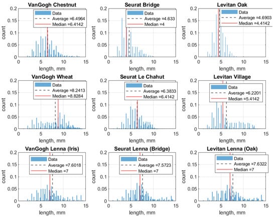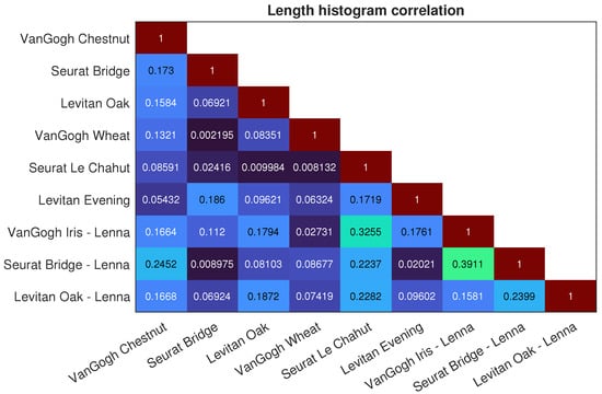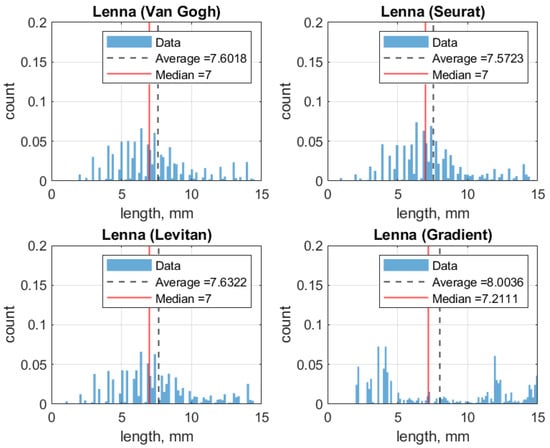 Nevertheless, no extensive research on quantifying the image stylizing qualities of the NST and heuristic approaches has been conducted. Thus, in order to clarify this question, we propose a new experiment design for comparing two brushstroke rendering algorithms. In our experiment, we consider six brushstroke features in images generated by these algorithms from a test image set. For each feature, a histogram is built, and then, four correlation tests for these histograms are carried out: similar artist test, method 1 vs. method 2 test, similar image test, and real painting test. A detailed description of these tests is given in Section 3. As the result of applying our experimental approach, we obtain numerical estimates of whether these brushstroke rendering algorithms have different rendering styles, and whether one or another algorithm is superior in style variation and mimicking a real artist’s style.