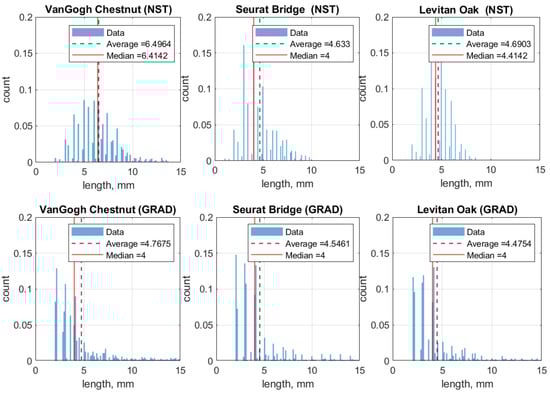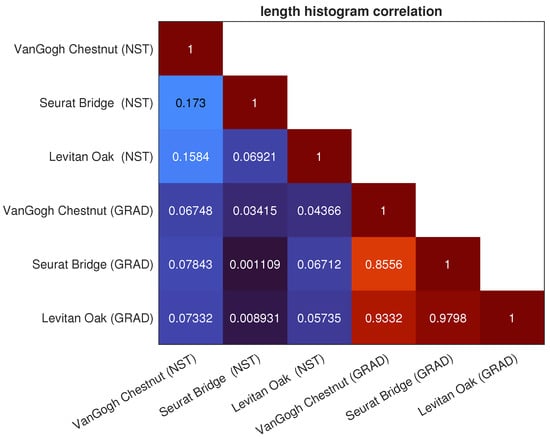 Figure A17. Brushstroke length histogram correlation for three paintings rendered with the NST algorithm and one painting with the gradient algorithm in test 3.