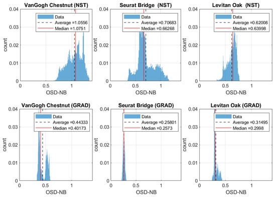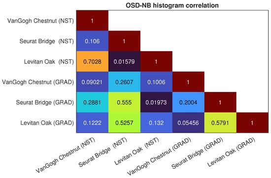 Figure A22. OSD-NB histogram correlation for three paintings rendered with the NST algorithm and one painting with the gradient algorithm in test 3.