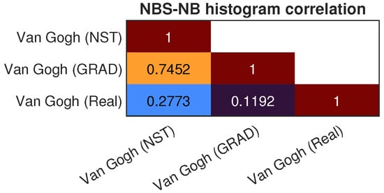 Figure A20. NBS-NB histogram correlation for three paintings rendered with the NST algorithm and one painting with the gradient algorithm in test 3.
