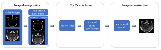 Because the variational method has a mature theoretical system and it is easy to design and analyze [14], it is widely used in image recovery [15], image denoising [16], and image fusion [17]. The authors in the literature [15] proposed a variational model for local non-texture inpainting based on the total variational model and the Mumford–Shah model. The authors in the literature [16] proposed a fractional-order total variational model for image denoising. In the literature [17], a three-step method for fusing clear images is proposed, as shown in Figure 1. In the image decomposition step, the images are processed using a variational model based on the data-driven tight frame (DDTF):