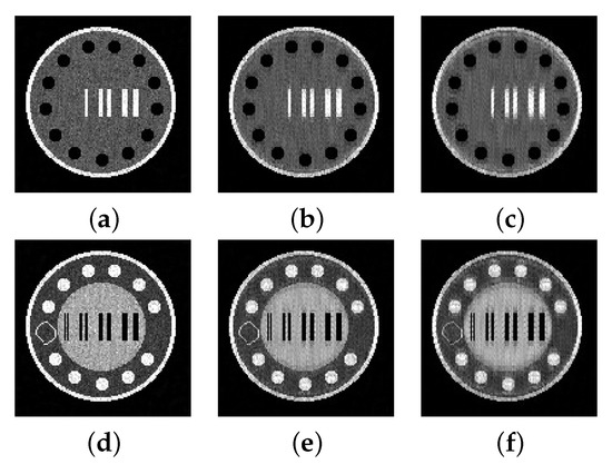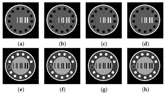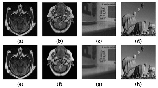 In all the experiments, the most appropriate parameters are chosen from the set of parameters , , and , . Firstly, we process the two medical images at peaks 55 and 155 and set = 1.6, K = 16, and the results are shown in Figure 6.