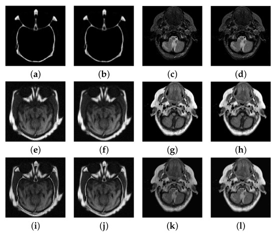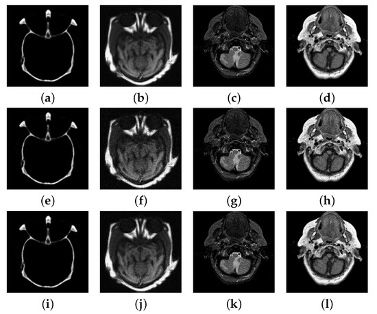 The four columns (a–l) are the denoised image and fused images obtained by processing the medical images at the peak of 55 and 155, respectively.