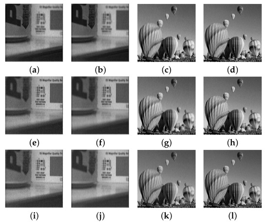 The four columns (a–l) are the denoised image and fused images obtained by processing the multifocus images at the peak of 155 and 255, respectively.