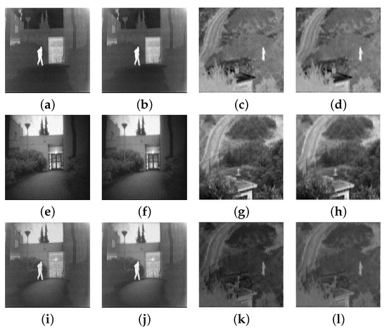 The four columns (a–l) are the denoised image and fused images obtained by processing the infrared and visible images at peaks of 155 and 255, respectively.