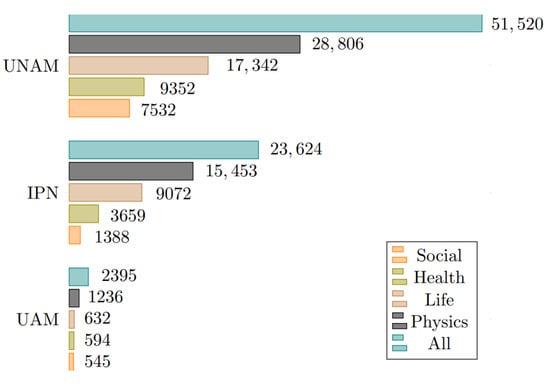Data included in this study were retrieved from the Scopus database via the Scopus API (see http://api.elsevier.com and http://www.scopus.com accessed on 7 March 2023) using the pybliometrics library for Python [12]. We searched for articles published between 2012 and 2021, where at least one coauthor is affiliated with one of the following three major Mexican universities (although the rest of the coauthors may have different affiliations): the National Autonomous University of Mexico (UNAM), the National Polytechnic Institute (IPN), and the Metropolitan Autonomous University (UAM). The data collected consist of metadata built from 74,400 articles, which were classified into three categories: UNAM, IPN, and UAM. An article is in the UNAM category if its listed affiliations (the listed affiliations of an article include every affiliation associated with each of its coauthors) include UNAM; the categories IPN and UAM are defined similarly. Note that an article can be classified into more than one of the aforementioned categories. The distribution of articles among the mentioned universities is as follows: UNAM 51,520; IPN 23,624; and UAM 2394, see Figure 1. It is important to mention that this distribution is related to the distribution of associate and full professors per university, which according to the 2021 faculty registries is as follows: UNAM 8510; IPN 5758; and UAM 2673 [13,14,15].