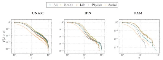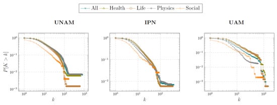 Figure 2 shows the complementary cumulative distribution functions for the coauthor count in the cases of the three universities and subject areas analyzed. The log–log scale shows that most of the distributions consist of three parts that have a linear fit, each of them with a different slope. Therefore, the distributions functions could fit piecewise functions that follow the power law with different exponents. These characteristics indicate that the distributions of coauthors per article follow a scale-free distribution, where we have a small number of articles with a high number of coauthors, while most of the articles have a moderate number of coauthors.