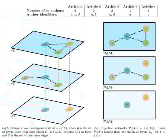 Using our methodology, in contrast to [4,5,6,7,8], we employ a multilayer network model to represent coauthorship networks, which captures higher-order interactions that cannot be represented in traditional coauthorship networks [9,10,11]. The multilayer network model can be defined as a tuple , where is the set of graphs . In this model, each layer represents the coauthorship network of articles cowritten by exactly i authors. The nodes in each layer represent authors, intralayer edges in represent coauthorship relations, and interlayer edges in connect the same author at different layers. This approach gives a microscopic view of different orders of collaboration and allows us to explore the evolution and emergence of collaboration patterns.