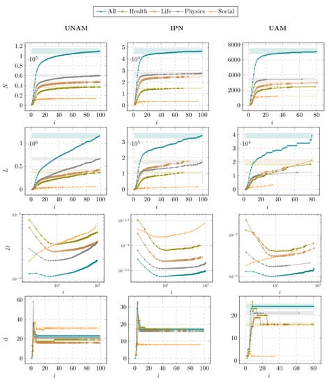 Values of basic metrics in the coauthorship networks of the different universities and subject areas: the vertical axis shows the number of nodes N, the number of edges L, the network density D, and the diameter of the largest connected component d, while the horizontal axis represents the collaboration order i of the networks .
